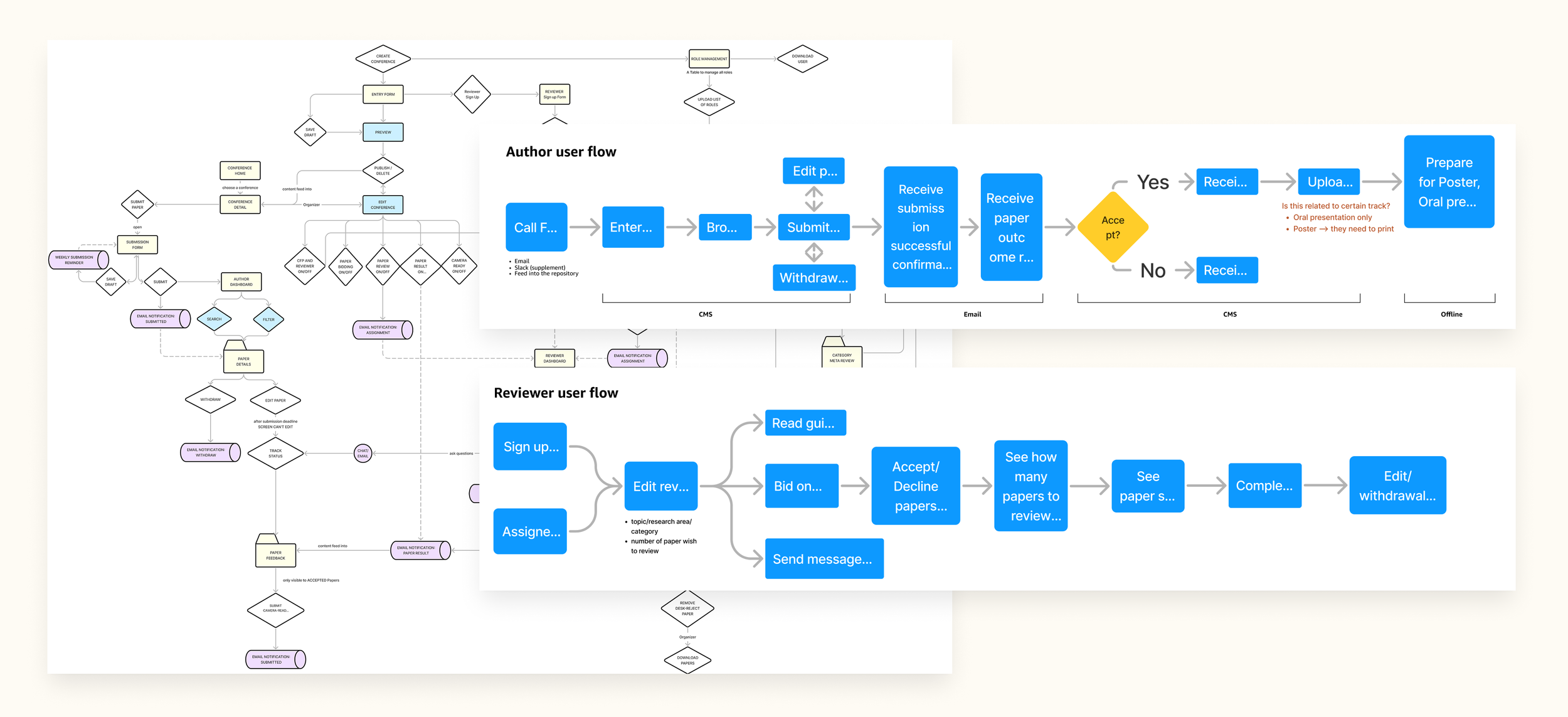 Establishing the Information Architecture (IA): Since no previous system or workflow existed, I developed the entire IA to support four distinct user roles: Authors, Reviewers, Area Chairs, and Event Organizers.