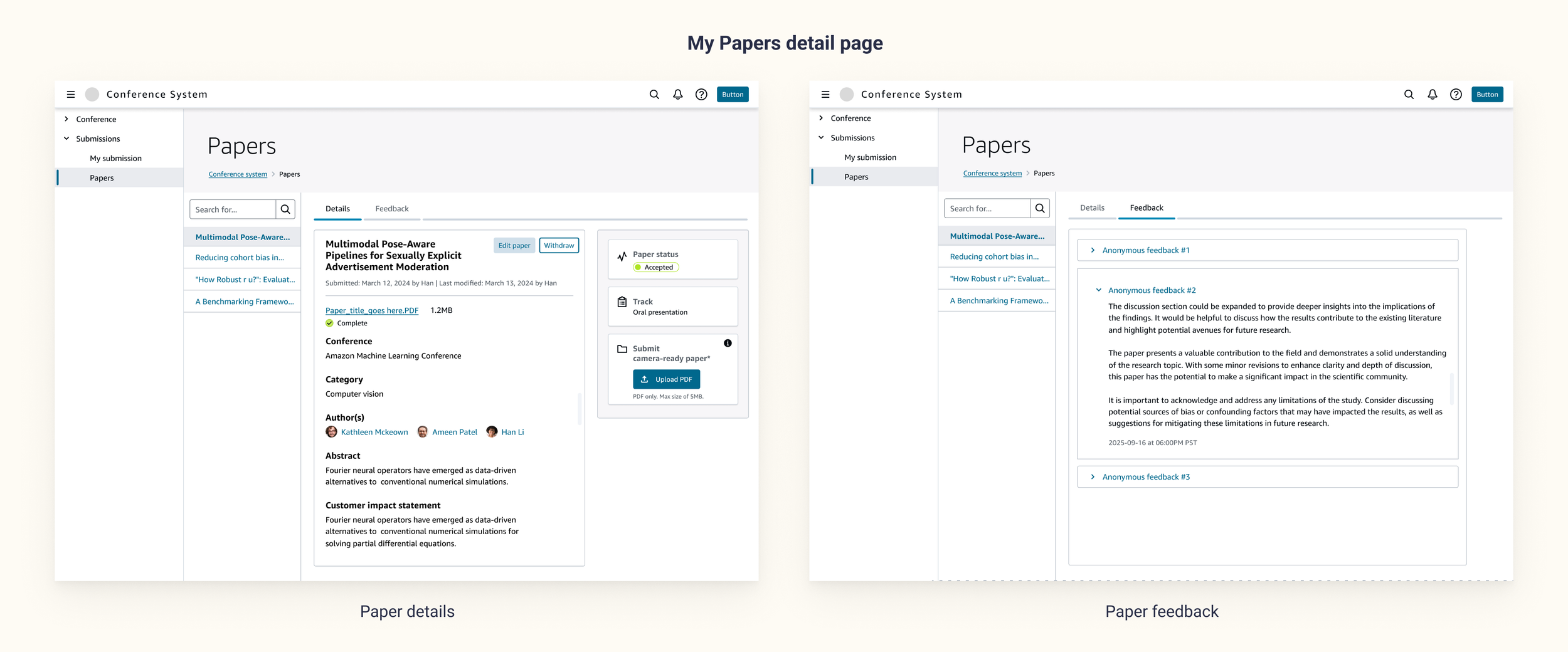 I started with low-fidelity wireframes to validate assumptions early. A key challenge was the "My Papers" detail page for authors, where users track acceptance status and receive feedback.